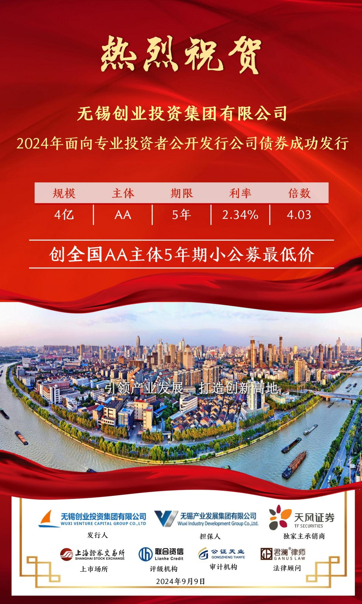 9月9日,無錫創(chuàng)業(yè)投資集團有限公司(簡稱“無錫創(chuàng)投集團”)2024年面向專業(yè)投資者公開發(fā)行公司債券“24錫創(chuàng)01”成功發(fā)行,發(fā)行規(guī)模4億元,發(fā)行期限5年,認購倍數(shù)4.03倍,票面利率2.34%,創(chuàng)全國可比債券歷史發(fā)行最低利率!本期債券由天風證券承銷,主體評級AA,債項評級AAA。 無錫創(chuàng)投集團作為無錫產(chǎn)業(yè)集團旗下的創(chuàng)業(yè)投資和股權投資平臺,近年來在集團的正確領導和大力支持下,圍繞無錫“465”現(xiàn)代化產(chǎn)業(yè)集群建設,聚焦產(chǎn)業(yè)集團“1+4+X”產(chǎn)業(yè)布局,持續(xù)深化產(chǎn)融協(xié)同合作,不斷提升資金使用效率,努力為公司高質量發(fā)展提供更低成本、更長周期、更加靈活的資金支持。未來,公司將繼續(xù)承擔國企社會責任,勇挑重擔,發(fā)揮自身優(yōu)勢,持續(xù)為無錫新質生產(chǎn)力和實體經(jīng)濟高質量發(fā)展注入新活力、增添新動能。 |