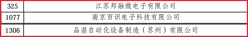 近日,江蘇省工信廳發(fā)布了《關(guān)于江蘇省2024年度省級專精特新中小企業(yè)(第二批)和 2021年度省級專精特新中小企業(yè)復(fù)核通過企業(yè)名單的公示》,江蘇邦融微電子有限公司、南京百識電子科技有限公司、品湛自動化設(shè)備制造(蘇州)有限公司3家創(chuàng)投集團被投企業(yè)入選第二批專精特新中小企業(yè)。